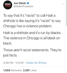 The #WokeJoeWalsh upside though, is pretty interesting: Walsh knows how to handle the media--he has extensive radio experience. He was a Tea Party guy--he knows that world and the language. When he punches at Trump? It may hurt--and as Trump thinks himself (with reason) a great "counter puncher" (especially at people less powerful than him)--he will be unable to stop himself from hitting back--being in a media battle with Trump is everything Joe Walsh could ask for--and it's exactly the right message that the Trumpists need to hear: